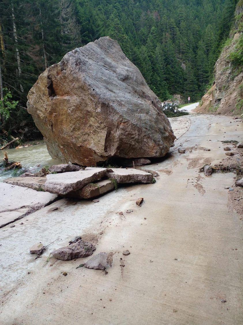 İkizdere ilçesine bağlı Anzer Yaylası'na giden yolda etkili olan sağanak yağışın ardından meydana gelen heyelanla birlikte dev kaya parçası koparak yol üzerine düştü.