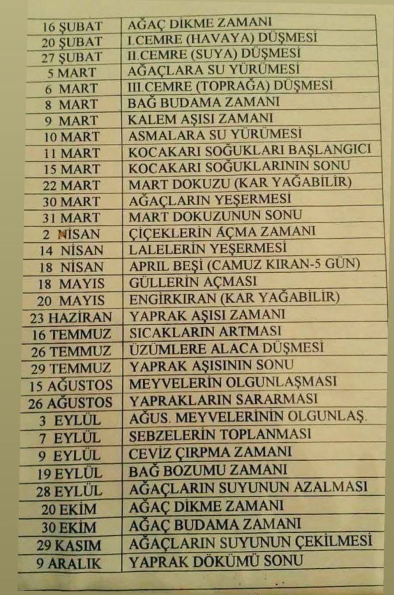 Mart ayında doğa uyanırken, Nisan ve Mayıs aylarında çiçekler açıyor, üreticiler ise “April beşi” ve “Engir kıran” gibi ani hava olaylarına karşı tedbir alıyor. Yaz aylarında meyveler olgunlaşırken, Ağustos ayında hasat hazırlıkları başlıyor. Sonbaharda ise sebzeler toplanıyor, ağaçlar dinlenmeye giriyor.