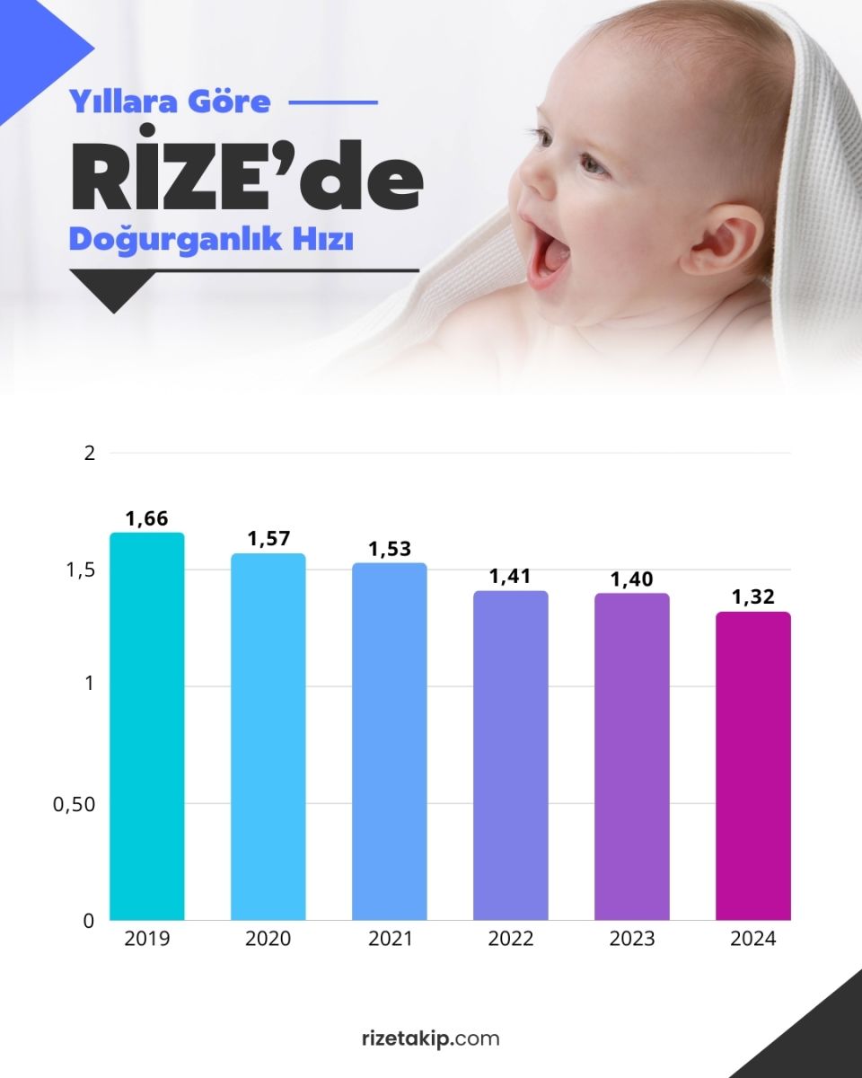 Rize’de doğurganlık hızına ilişkin veriler açıklandı. Buna göre, 2019 yılında 1,66 olarak kaydedilen toplam doğurganlık hızı, 2024 yılı itibarıyla 1,32 seviyesine düştü.