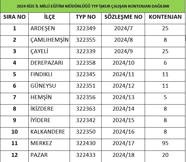 Rize'de İŞKUR ve İl Milli Eğitim Müdürlüğü işbirliğiyle, temizlik hizmetleri için merkez ve ilçelerde 230 kişi Toplum Yararına Programlar (TYP) kapsamında istihdam edilecek. 24-26 Eylül tarihleri arasında yapılan başvurular sonrası, noter kurası 30 Eylül Pazartesi günü, saat 15:00’de Ali Metin Kazancı Rize Lisesi Konferans Salonu’nda yapılacak.