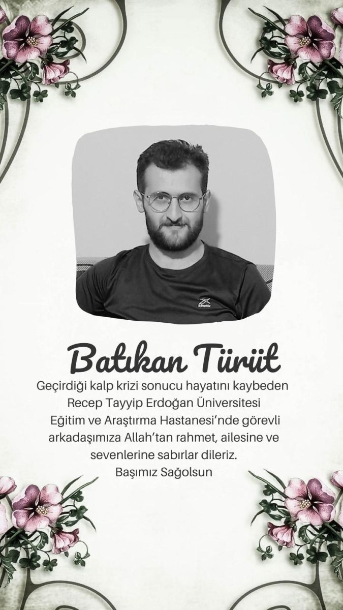 Rize Recep Tayyip Erdoğan Üniversitesi Eğitim ve Araştırma Hastanesi’nde çalışan 34 yaşındaki Batıkan Türüt, kalp krizi sonucu hayatını kaybetti.