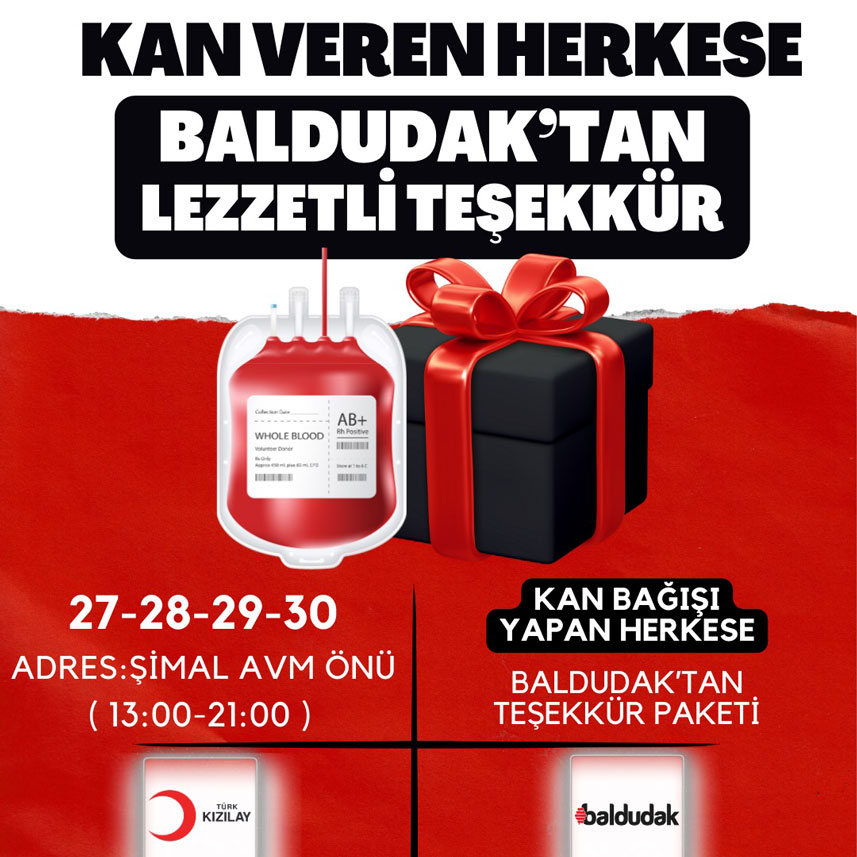 Türk Kızılayı ve Baldudak işbirliği ile 27-28-29-30 Kasım tarihleri arasında Şimal Avm önünde kurulacak olan kan bağış yerinde kan verenlere Baldudak markasından bal hediye edilecek.