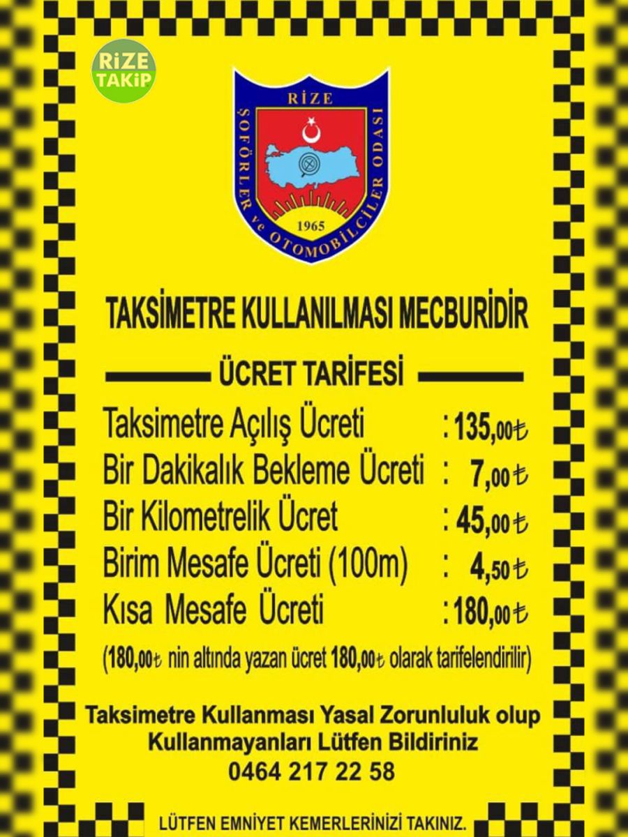 Rize’de taksi ücretleri güncellendi. Yeni tarifeye göre açılış ücreti 135 TL, indi-bindi ücreti 180 TL, kilometre ücreti 45 TL olarak uygulanacak.