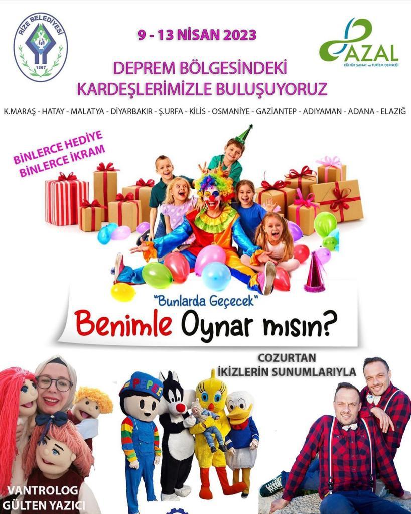 Rize Belediyesi ve Rize Azal Kültür Sanat ve Turizm Derneği'nin düzenlemiş olduğu kampanyada deprem bölgesindeki çocukları eğlendirmek ve onları mutlu etmek adına "Benimle Oynar mısın" adlı etkinlik düzenlenecek.