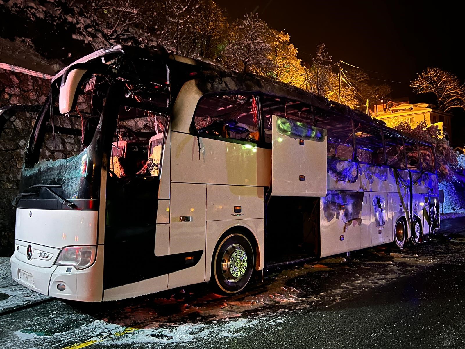 Rize'den hareket edip deprem bölgesi Malatya'ya görev için giden polis memurlarının bulunduğu otobüs, Trabzon'un Maçka ilçesindeki Zigana Dağı'nı tırmanırken Hamsiköy mevkiinde bilinmeyen bir nedenle alev aldı.