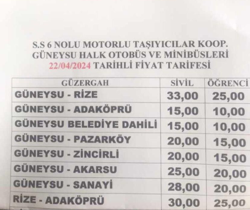 Rize ile Güneysu ilçesi arasında yolcu taşımacılığı yapan dolmuşlara zam geldi.