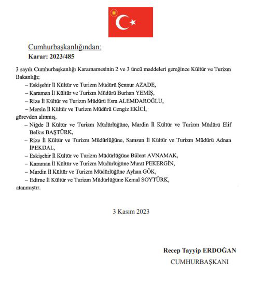 Cumhurbaşkanı Recep Tayyip Erdoğan imzasıyla yayımlanan kararlara göre, Rize İl Kültür ve Turizm Müdürü Esra Alemdaroğlu görevinden alındı.