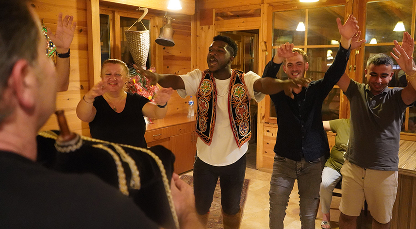 Komutçu çocuğun gelmemesiyle kendisinin artık horonları kendisinin kurmaya başladığını belirten Yahaya “4-5 yıldır bu otelde çalışıyorum. İlk çalıştığım zamanlar her akşam oynuyordular, bende sadece çalışıyordum ve izliyordum. Müzik ritmi kulağıma çok hoş geliyordu. Bir gün patron ‘Sende gir oyna’ dedi. Girdim, oynuyoruz, dönüyoruz, hoşuma gidiyor. İkinci gün de girdim, sonra oynaya oynaya öğrenmeye başladım. Türküleri hareketleri falan öğrendim. Bir gün komutçu çocuk gelmedi. Patron ‘Sen bu horonu oynatırsın’ dedi. Başladık, oynadık, güzel oldu. Sonra kendimi biraz daha geliştirdim ve şimdi ben kendim oynatıyorum” ifadelerini kullandı.