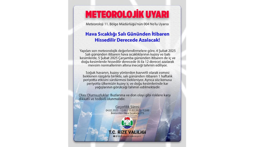 Rize Valiliği Meteoroloji Genel Müdürlüğü 11. Bölge Müdürlüğü’nün uyarısına göre, hava sıcaklıklarında hissedilir derecede düşüş yaşanacak.