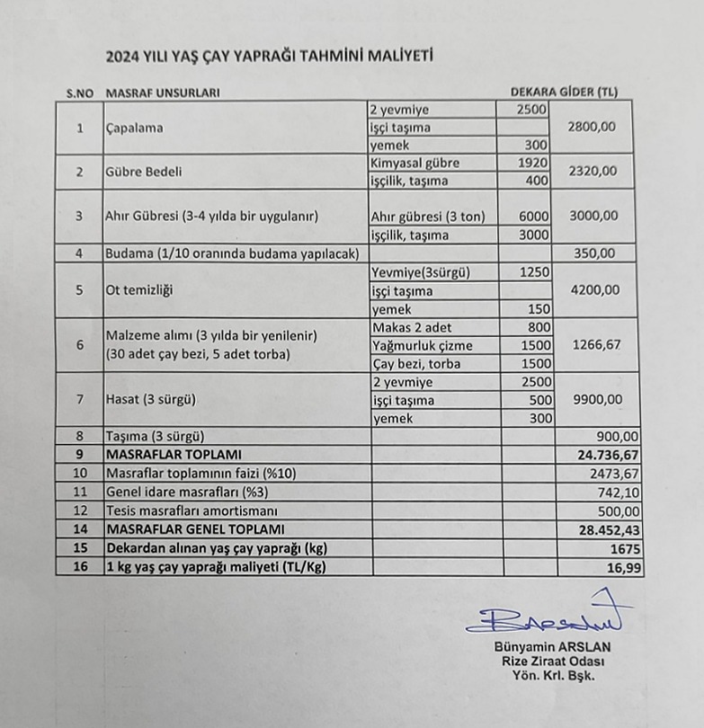 Yapılan paylaşımda, 1 kilogram çayın üreticiye maliyeti hesaplanırken, budama, gübre bedeli, çapalama, ahır gübresi (3-4 yılda bir uygulanır), ot temizliği, malzeme alımı ( çay bezi, torba vs.) 3 sürgü işçi yevmiyesi ve taşıma gibi masraflar baz alındı.