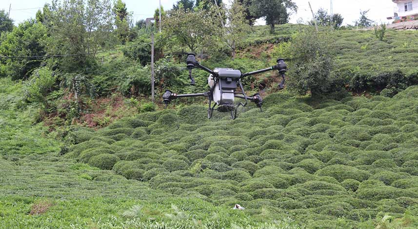 Rize Ziraat Odası, mülkiyeti kendine ait olan 15 dönümlük proje ve sera alanında dronla çay gübreleme uygulamasını denedi.