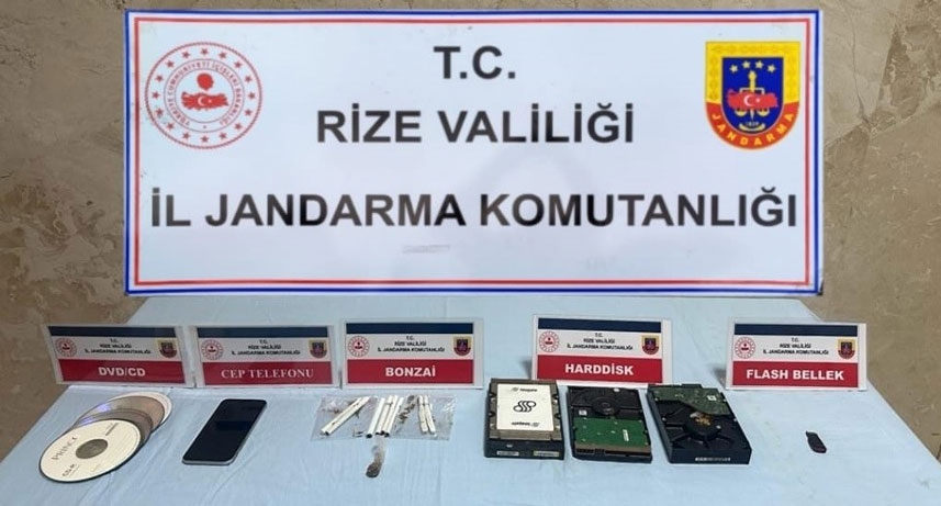 Rize Valiliği'nden yapılan açıklamada İl Jandarma Komutanlığı tarafından 10 - 17 Aralık tarihleri arasında icra edilen görevlerde; 3 adet hard disk, 5 adet DVD, 1 adet CD, 1 adet USB bellek, 1 cep telefonu, 12 gram bonzai, 15 gram kubar esrar maddesi, 60 gram esrar maddesi ve LL116ZZ plakalı aracın ele geçirildiği belirtildi.