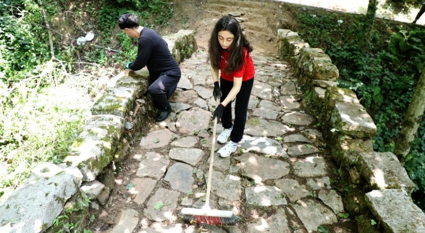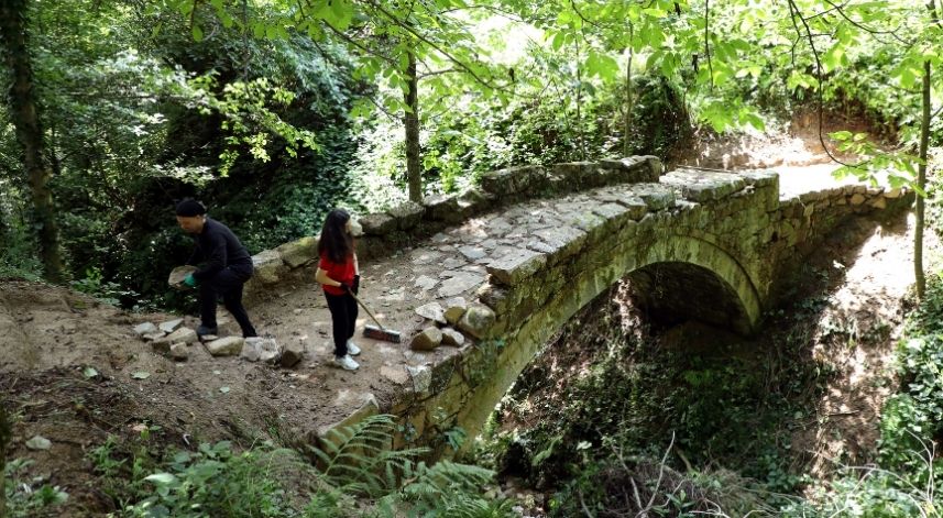 Rize'nin Hemşin ilçesinde Serdar Abay ve kızı Betül Abay, yabani otların kapladığı tarihi kemer köprüyü üç günde temizledi.
