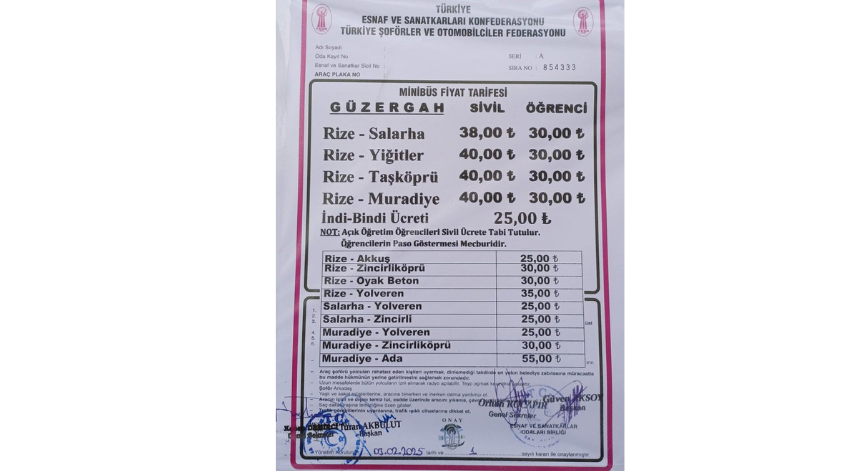Buna göre, Rize-Muradiye güzergahı 32 TL'den 40 TL'ye, Rize-Salarha güzergahı ise 30 TL'den 38 TL'ye yükseldi.
