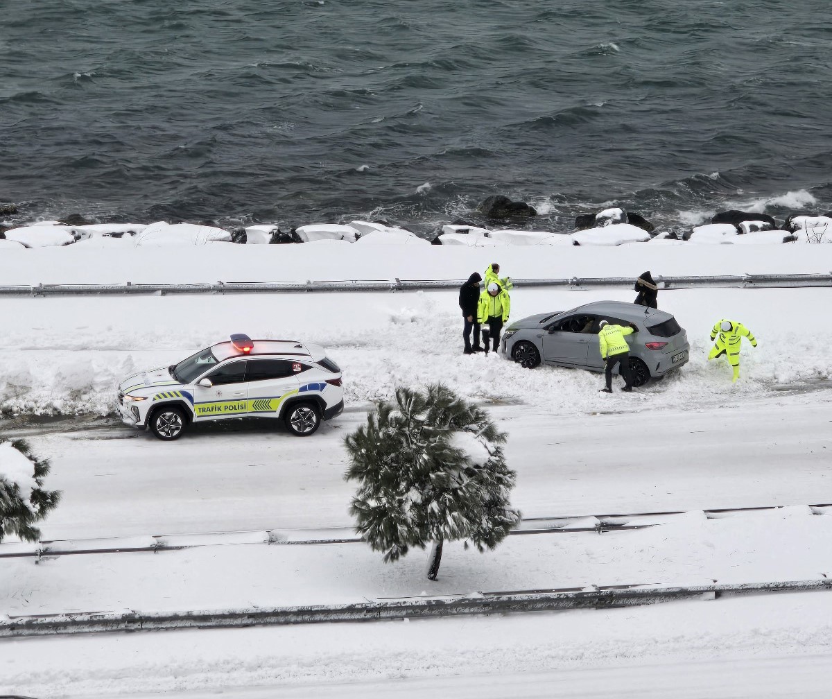 Rize'de yoğun kar yağışı nedeniyle Karadeniz Sahil Yolu'nda bozularak yol ortasında kalan aracı bölgedeki trafik polisleri iterek sürücüye yardımcı oldu.