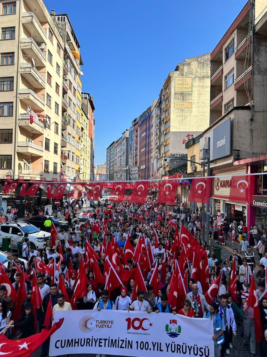 Rize Valiliği'nin önündeki Atatürk Anıtı'na çelenk sunulmasının ardından binlerce kişinin katılımıyla 'Cumhuriyet'imizin 100. Yılı Yürüyüşü' düzenlendi.