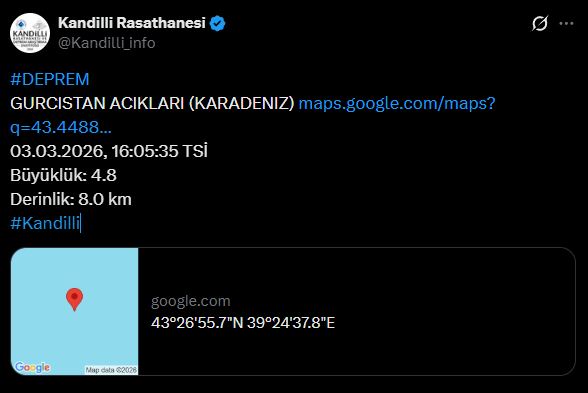 Kandilli Rasathanesi verilerine göre, saat 16.05'te Karadeniz'in Gürcistan açıklarında 4,8 büyüklüğünde deprem meydana geldi.