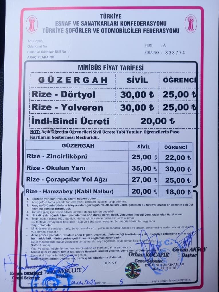 Rize'de nisan ayıyla birlikte dolmuş ücretlerine gelen zamlara bir yenisi daha eklendi.
