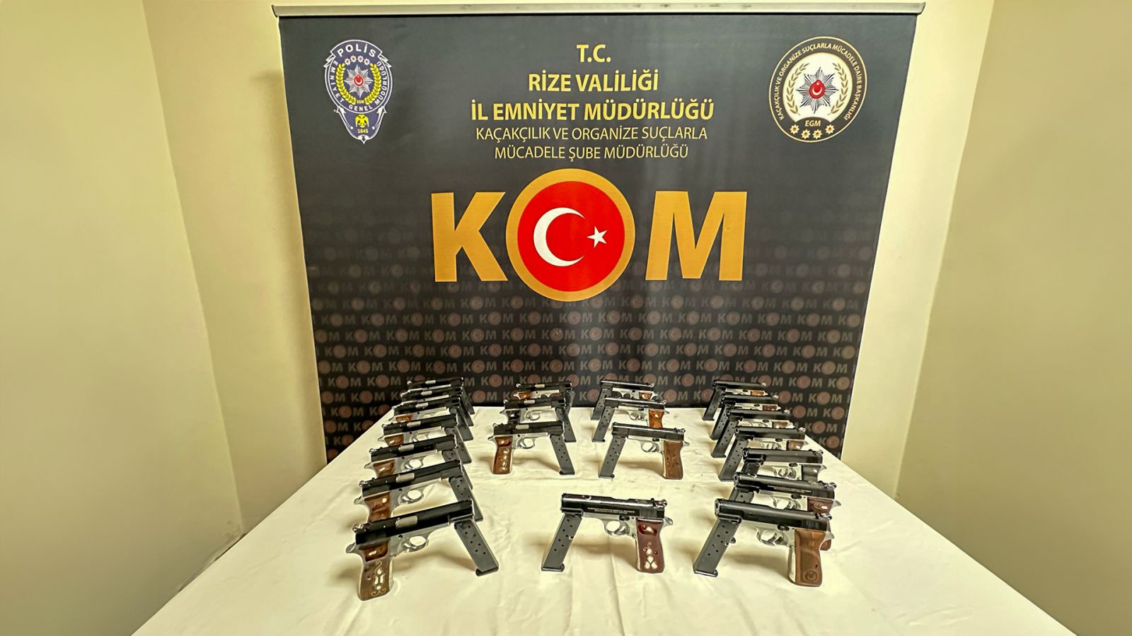 Rize İl Emniyet Müdürlüğü'nden yapılan açıklamada Kaçakçılık ve Organize Suçlarla Mücadele Şube Müdürlüğü ekiplerince yapılan çalışmalar neticesinde şehir merkezinde durdurulan bir araçta yapılan aramada; 21 adet ruhsatsız tabancanın ele geçirildiği belirtildi.