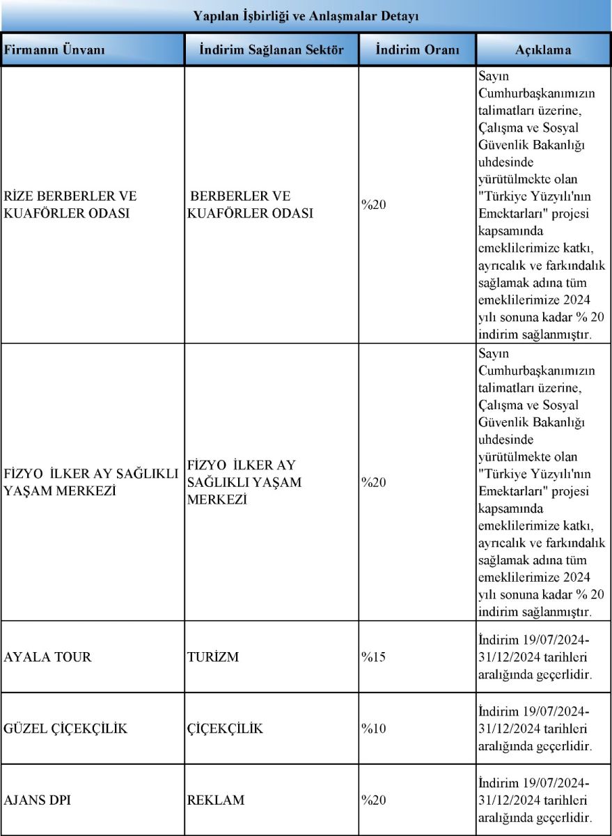 "Müdürlüğümüze gelen emeklilerimizin görüş ve önerilerini almak için 'emekli masası'nın kurulması, Recep Tayyip Erdoğan Üniversitesi ile 60 yaş ve üzeri emeklilerimiz için '3. yaş üniversitesi protokolü', sivil toplum kuruluşları ziyaretleri ve bazı büyük ölçekli işletmelerimiz ziyaret edildi. İşletmelerimizden emeklilerimiz için indirimler talep edildi. Birçok işletmemiz sağolsunlar projeye destek verdiler, olumlu yönde katılım sağlandı. Yapılan çalışmalar sonucunda elde edilen kazanımlar ve sağlanacak indirimler ve firmalarımızın isimleri 'emekliler.gov.tr' adresinden ilan edilmiştir. Daha sonra katılım gösterecek işletmelerimizin isimleri her hafta cuma günü merkeze bildirilecek olup sitemizce duyurulacaktır."