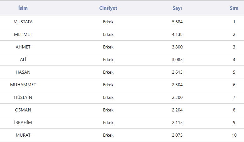 Erkeklerde, 4 bin 138 kişi ile ‘Mehmet’, 3 bin 800 kişi ile Ahmet ve 3 bin 85 kişi ile ‘Ali’ takip etti.