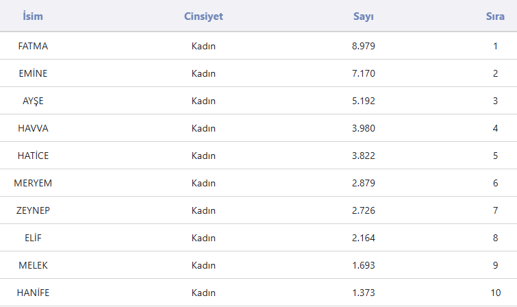 Kadınlarda ise, Emine ismini 7 bin 170 kişi, Ayşe ismini 5 bin 192 kişi ve Havva ismini kullanan 3 bin 980 kişi olduğu gözlemlendi.
