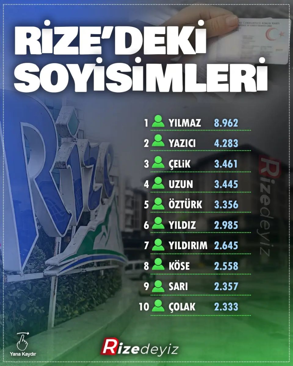 Rize'de, ülke genelinde olduğu gibi en çok kullanılan soyadı 'Yılmaz' oldu.