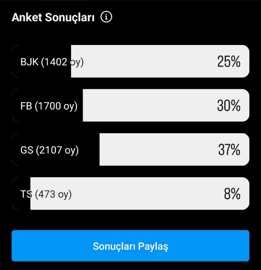 Rize Takip Instagram hesabının düzenlediği ankete göre; Beşiktaş, Fenerbahçe, Galatasaray ve Trabzonspor seçenekleri arasından ‘Rizespor hariç hangi takımı desteklemeyi tercih edersiniz’ sorusuna katılımcıların çoğunluğu Galatasaray yanıtı verdi. 2 bin 107 kişi sarı-kırmızılıları tercih etti.