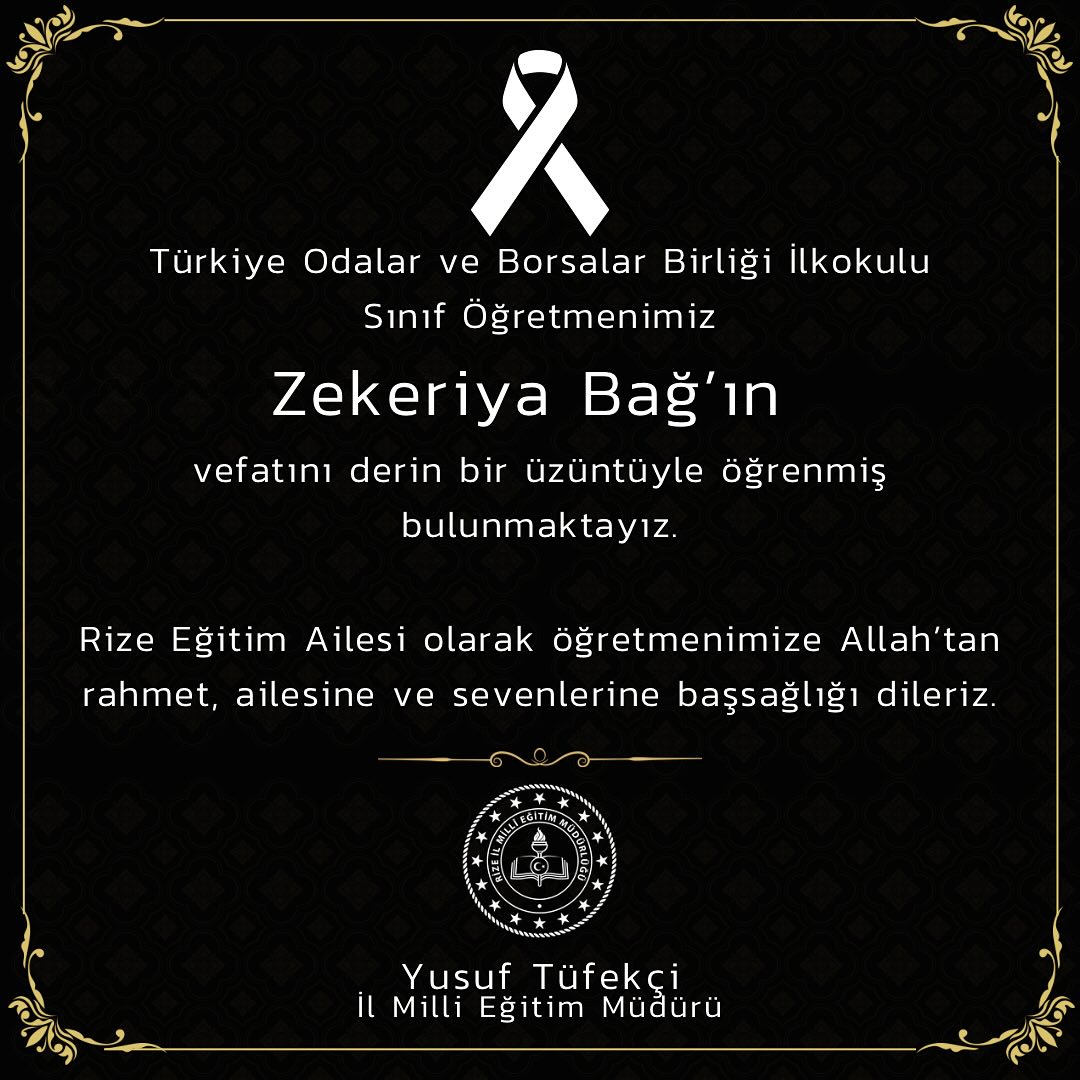 Rize İl Milli Eğitim Müdürlüğü'nden yapılan açıklamada, "Türkiye Odalar ve Borsalar Birliği İlkokulu sınıf öğretmenimiz Zekeriya Bağ'ın vefatını derin bir üzüntüyle öğrenmiş bulunmaktayız. Rize eğitim ailesi olarak öğretmenimize Allah'tan rahmet, ailesine ve sevenlerine başsağlığı dileriz." denildi.