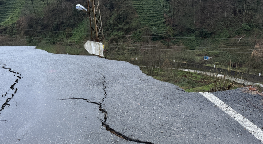 Yolun kenarındaki istinat duvarının çökmesi sonucu toprak kayması meydana geldi. Yol kenarındaki yüksek gerilim direği de çökme nedeniyle aşağı kaydı.