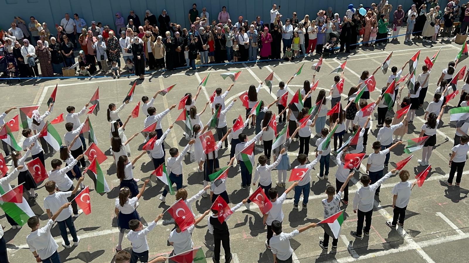 Denizciler İlkokulu bahçesinde düzenlenen mezuniyet törenine katılan 150 öğrenci, Filistin ve Türk bayrakları ile gösteri yaparak İsrail saldırıları altındaki Filistin'e destek verdi.