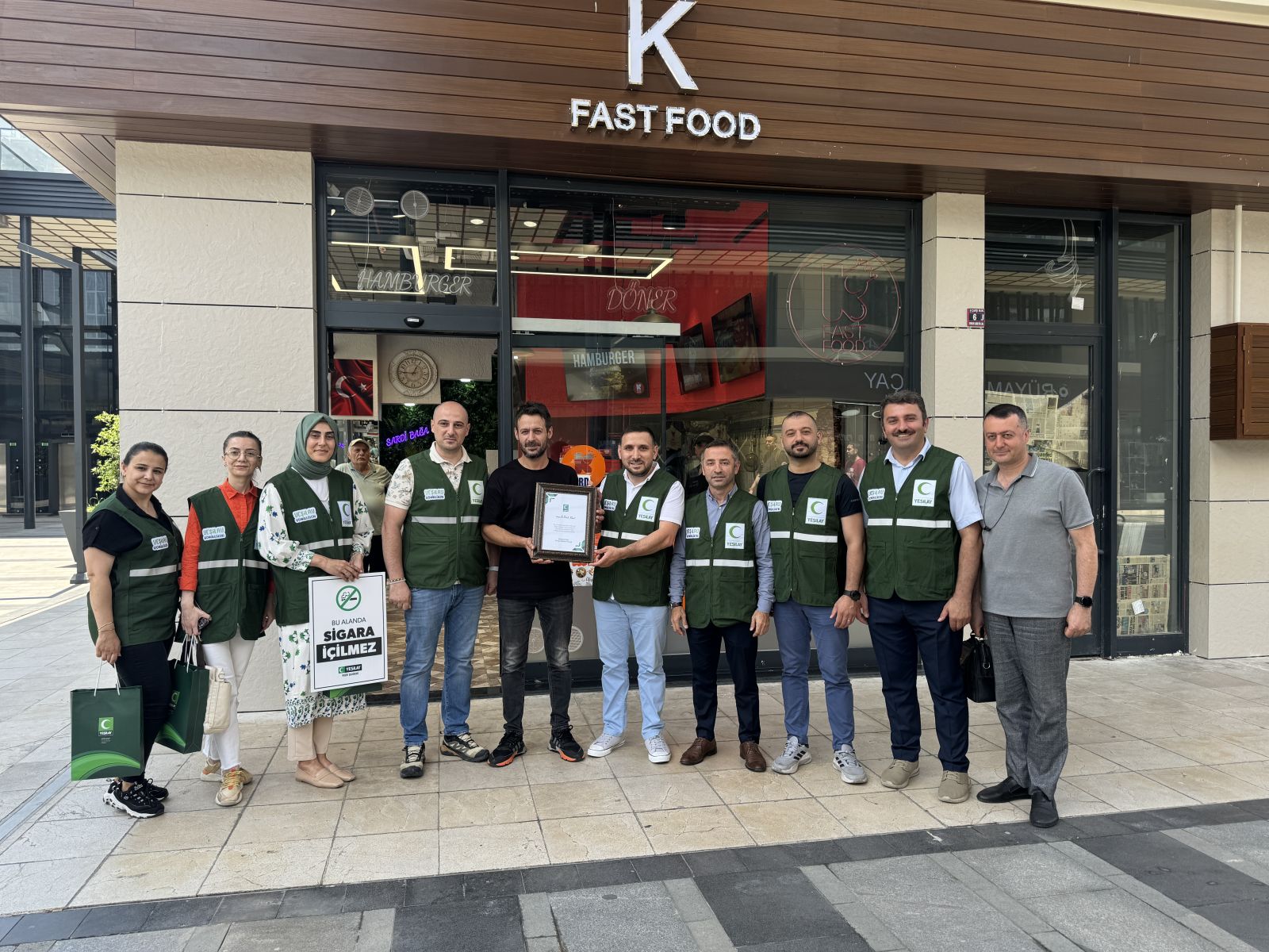 Yeşilay Şube Başkanı Selçuk Beşikçi ve yönetim kurulu üyeleri, ziyaret ettiği iş yeri sorumlularına plaket takdim etti.