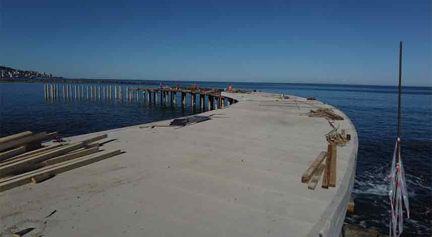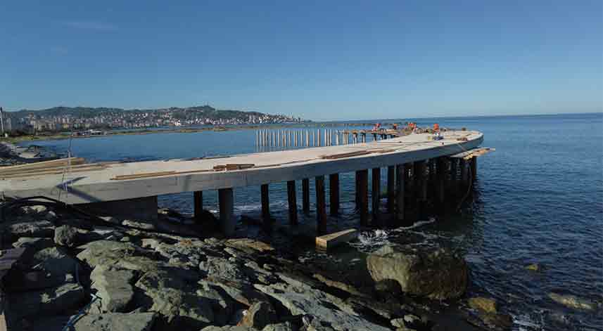 Rize Belediyesi'nden yapılan açıklamada, sahil rekreasyon alanına entegre olarak yapımına başlanan iskele projesinin başlangıç kısmında yapılan betonlama çalışmasının ardından kalan kısımda da betona hazırlık kalıp çalışmasının devam ettiği belirtildi.