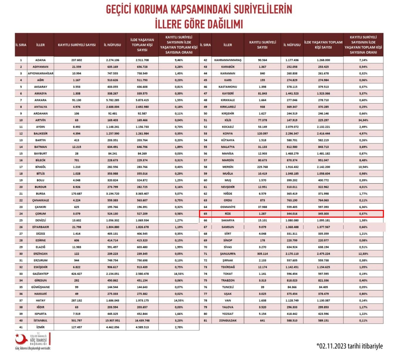 Buna göre, 2 Kasım itibariyle Rize'de 1287 geçici koruma altındaki Suriyeli bulunuyor. Rize'de ikamet izni bulunan yabancı sayısı ise 854 olarak kayıtlara geçti.
