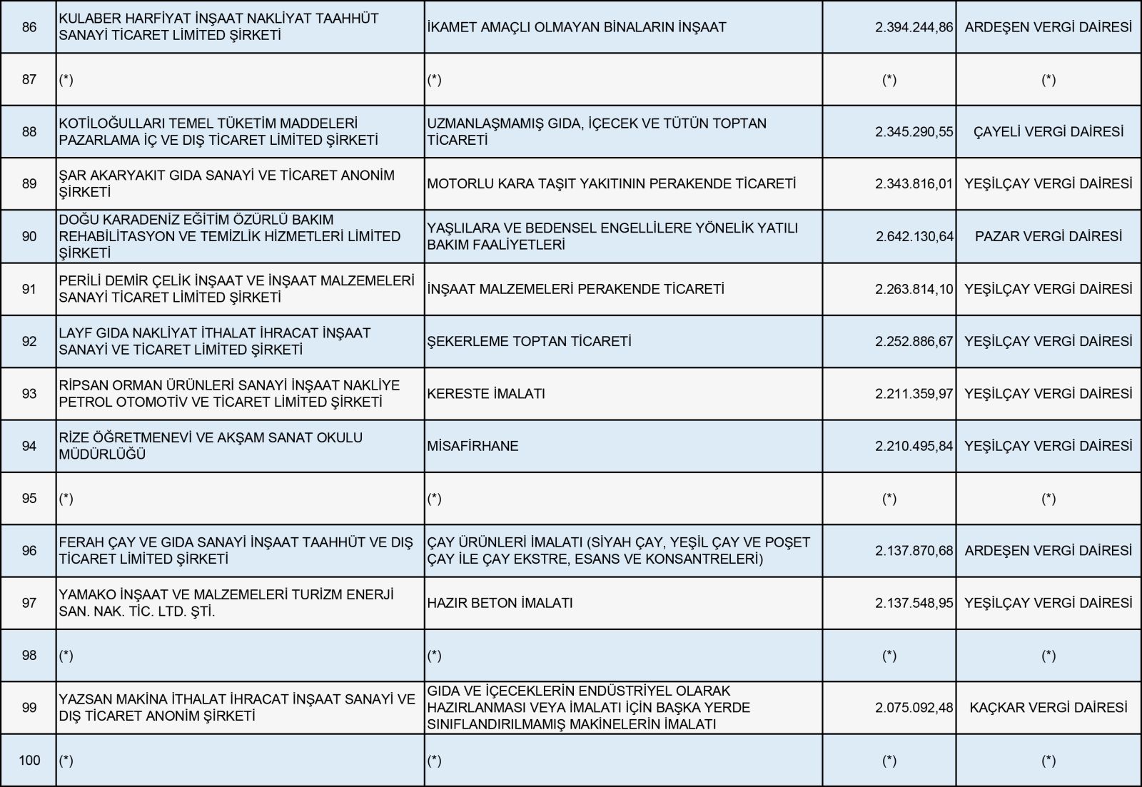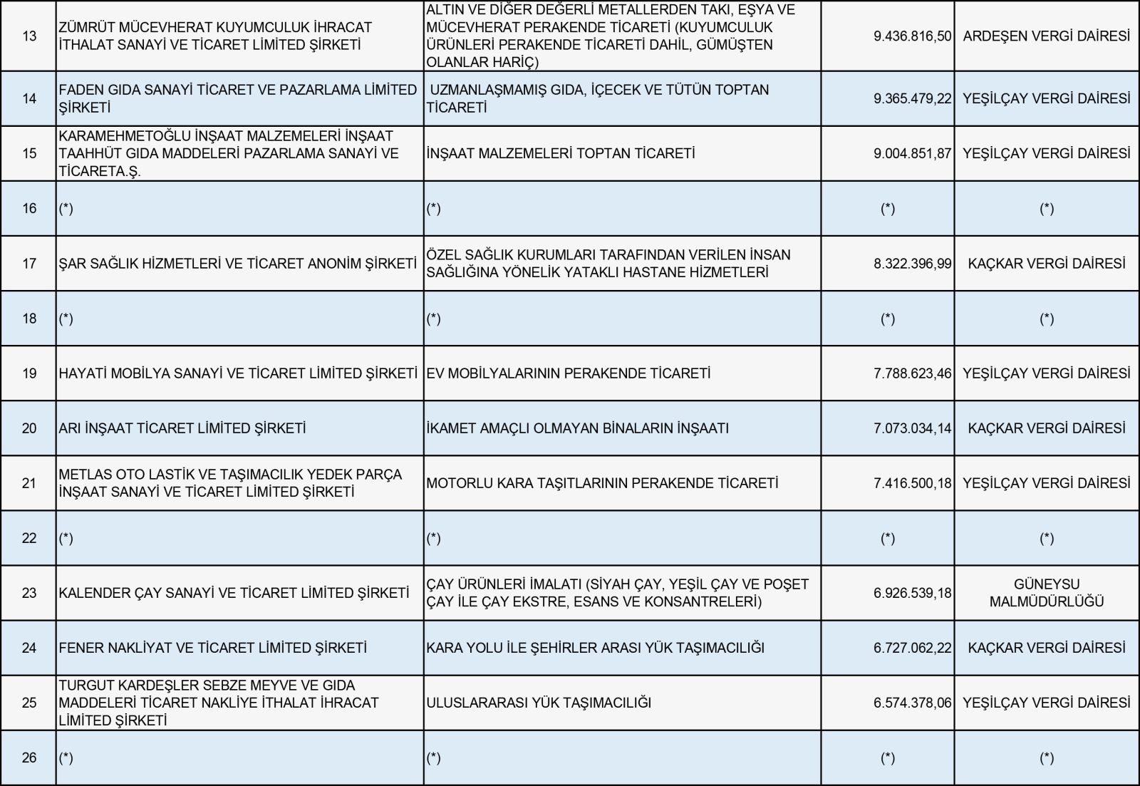 Çayeli Bakır İşletmeleri Anonim Şirketi 72 milyon 215 bin 289,81 TL ile ikinci, Kuzuoğlu Su Ürünleri Sanayi Ve Ticaret Anonim Şirketi 45 milyon 170 bin 561,72 TL ile üçüncü, Şar İnşaat Sanayi ve Ticaret Anonim Şirketi 32 milyon 401 bin 584,89 TL ile dördüncü ve Temsan Yol Yapım İnşaat Turizm Nakliyat Enerji Orman Ürünleri Sanayi Ve Ticaret Limited Şirketi 24 milyon 243 bin 917,87 TL ile beşinci sırada yer aldı.