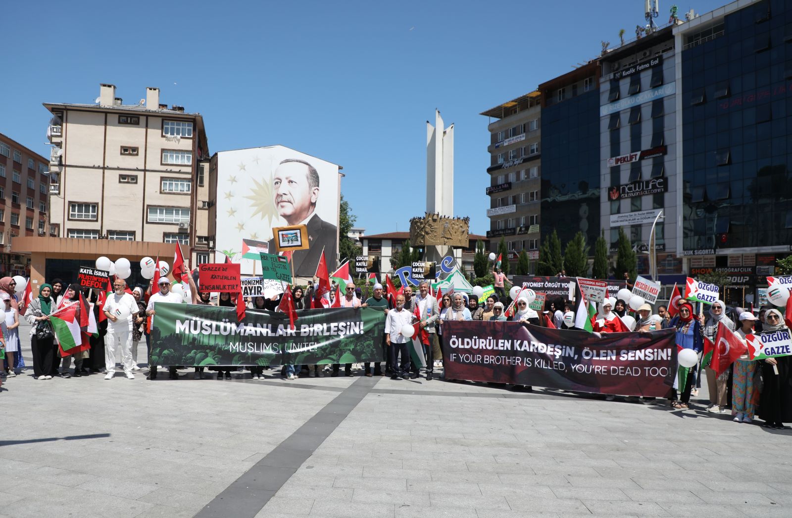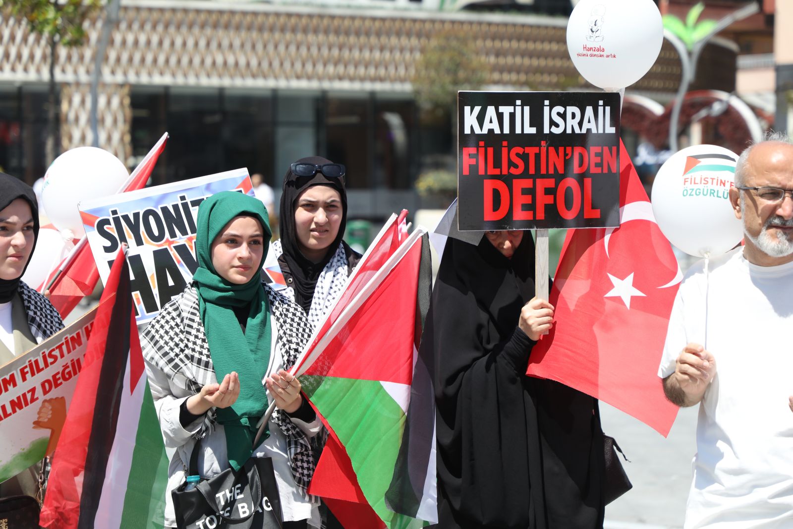 Şehit Onur Kılıç Anadolu Kız İmam Hatip Lisesi öğretmen ve öğrencileri, Türk ve Filistin bayrakları ile İsrail aleyhine çeşitli yazıların yer aldığı dövizlerle Sahil Camisi önünde toplandı.