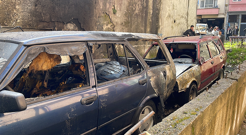 Rize’de park halinde bulunan 2 otomobil alev alev yandı. Otomobiller kullanılamaz hale geldi.
