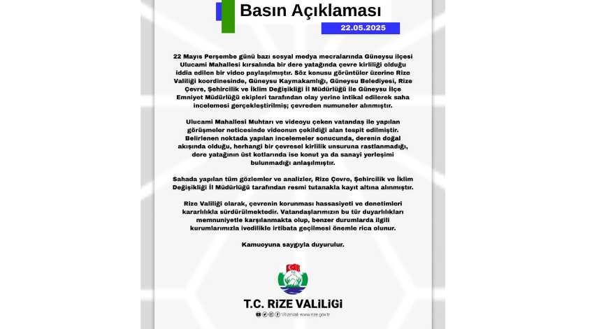 Rize Valiliği de konuya ilişkin yazılı açıklama yaptı. Açıklamada, Valilik koordinesinde Güneysu Kaymakamlığı, Güneysu Belediyesi, Çevre, Şehircilik ve İklim Değişikliği İl Müdürlüğü ile Güneysu İlçe Emniyet Müdürlüğü ekipleri tarafından olay yerinde saha incelemesi gerçekleştirildiği bildirildi. Sudan alınan numunelerin incelendiği belirtilen açıklamada şunlar kaydedildi: "Çevreden numuneler alınmıştır. Ulucami Mahallesi muhtarı ve videoyu çeken vatandaş ile yapılan görüşmeler neticesinde videonun çekildiği alan tespit edilmiştir. Belirlenen noktada yapılan incelemeler sonucunda derenin doğal akışında olduğu, herhangi bir çevresel kirlilik unsuruna rastlanmadığı, dere yatağının üst kotlarında ise konut ya da sanayi yerleşimi bulunmadığı anlaşılmıştır. Sahada yapılan tüm gözlemler ve analizler Çevre, Şehircilik ve İklim Değişikliği İl Müdürlüğü tarafından resmi tutanakla kayıt altına alınmıştır. Vatandaşlarımızın bu tür duyarlılıkları memnuniyetle karşılanmakta olup, benzer durumlarda ilgili kurumlarımızla ivedilikle irtibata geçilmesi önemle rica olunur.