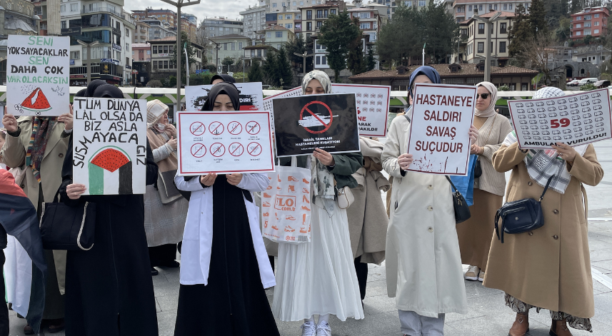 "Hastaneye saldırı savaş suçudur" ve "Tüm dünya lal olsa da biz asla susmayacağız" yazılı döviz taşıyan grup adına açıklama yapan tıp fakültesi 5. sınıf öğrencisi Furkan Alber, hekimler ve sağlık çalışanları olarak sessiz yürüyüşün 63. yürüyüşünü icra ettiklerini, Gazze'yi hatırlamak ve hatırlatmak için toplandıklarını söyledi.