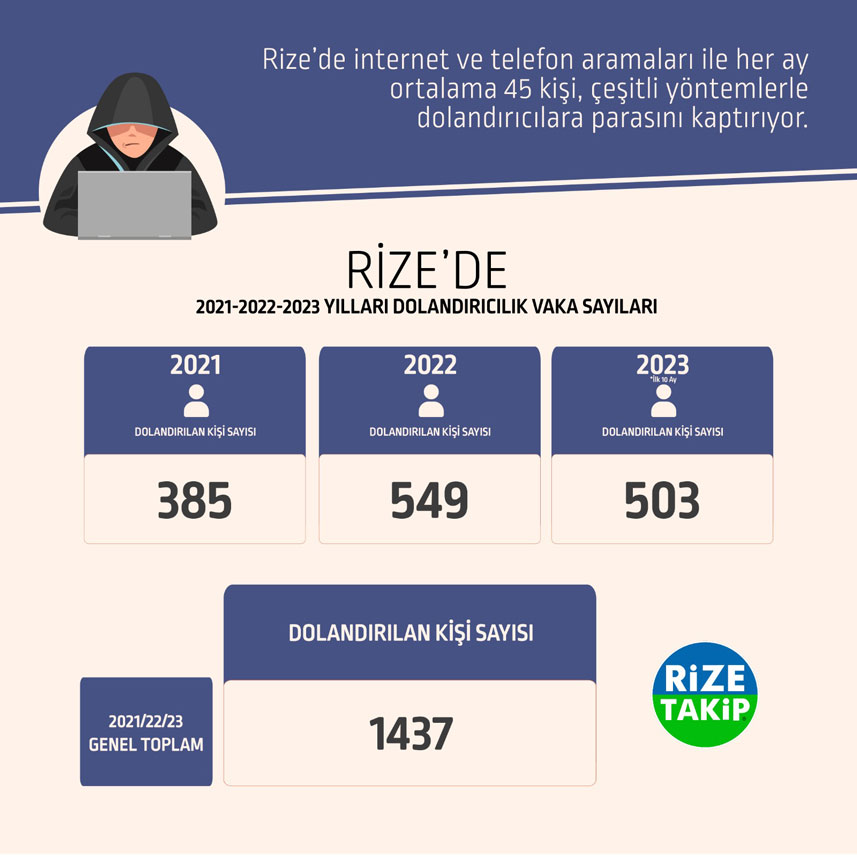 Rize'de 2021 yılında 385, 2022 yılında 549 ve 2023 yılında 503 kişi dolandırıldı; toplamda son 3 yılda 1437 kişi mağdur oldu.