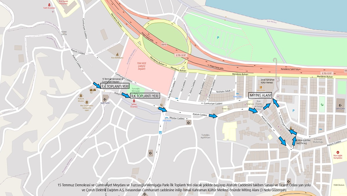 c) Dağılma Güzergahı: Rize Valiliği Tören Alanının sağ ve solundan çıkan Cumhuriyet Caddesi ile Menderes Bulvarı yan yol