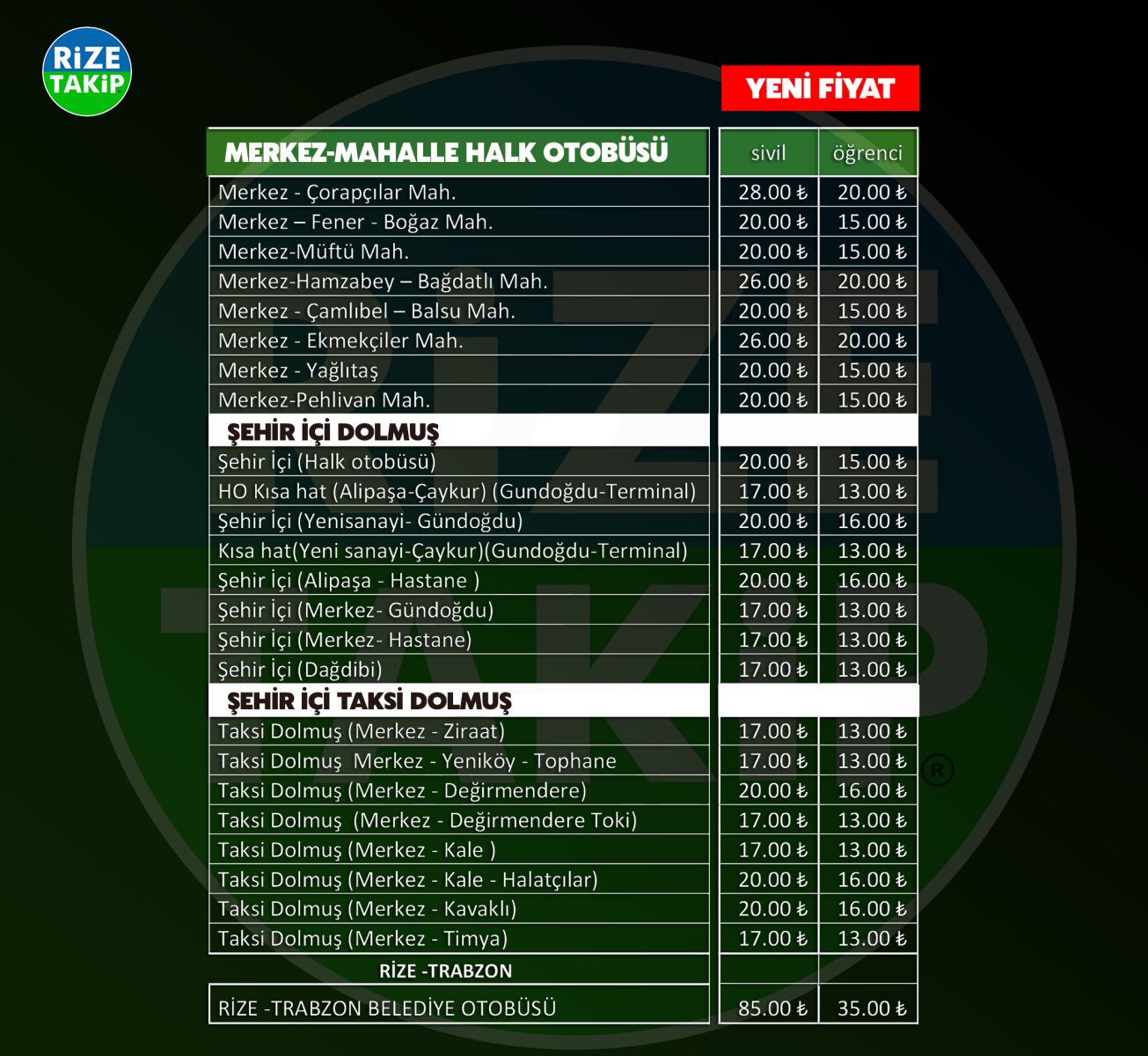 Rize'de şehir içi dolmuş şoförlerinin başta artan akaryakıt maliyetleri nedeniyle zam talep etmeleri sonucunda, şehir içi dolmuş, belediye halk otobüsü ve taksi dolmuş güzergahlarındaki ücretlerde değişiklik yapıldı.