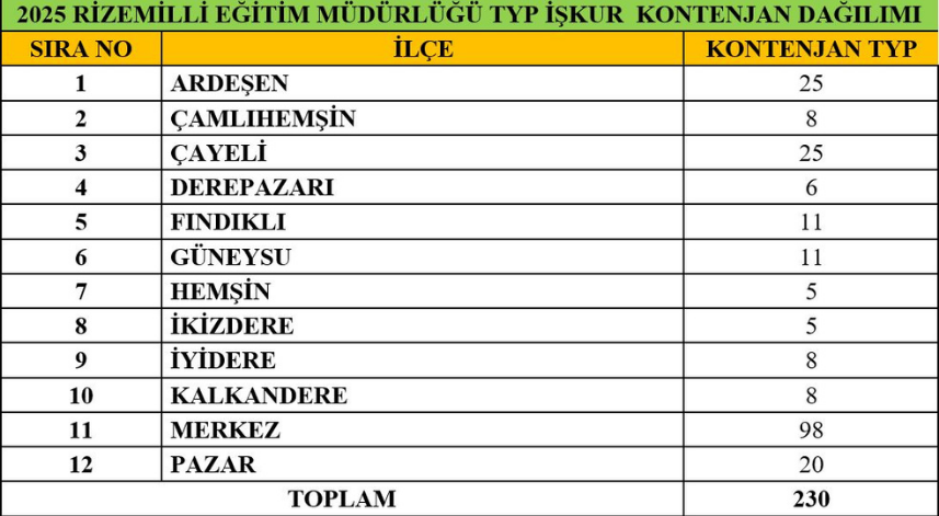 Rize'de Türkiye İş Kurumu (İŞKUR) ve İl Milli Eğitim Müdürlüğü işbirliğiyle, merkez ve ilçelerde 230 kişi Toplum Yararına Programlar (TYP) kapsamında istihdam edilecek.