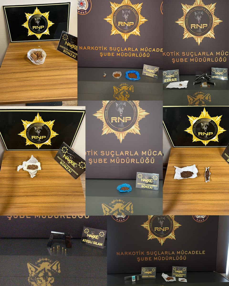 Açıklamada, söz konusu aramalarda; 251,95 gram sentetik cannobinoid (bonzai) maddesi, 19,06 gram esrar maddesi, 4,31 gram skunk maddesi, 1,84 gram metamfetamin maddesi, 3 kök kenevir bitkisi, 5 adet ectasy hap, 2 adet ruhsatsız tabanca ve tabancalara ait 32 fişek ile 1 adet hassas terazinin ele geçirildiği bildirildi.