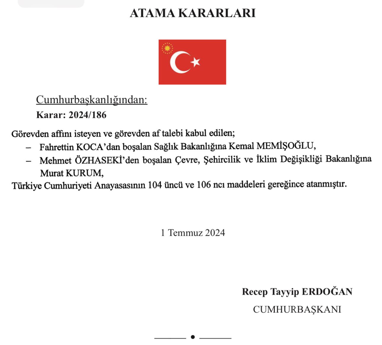 Çevre, Şehircilik ve İklim Değişikliği Bakanı Mehmet Özhaseki’nin yerine ise eski Bakan Murat Kurum atandı.