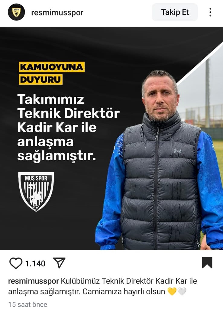 Rizeli Teknik Adam Kadir Kar, TFF 3. Lig ekiplerinden Muş 1984 Muşspor ile resmi sözleşme imzaladı.