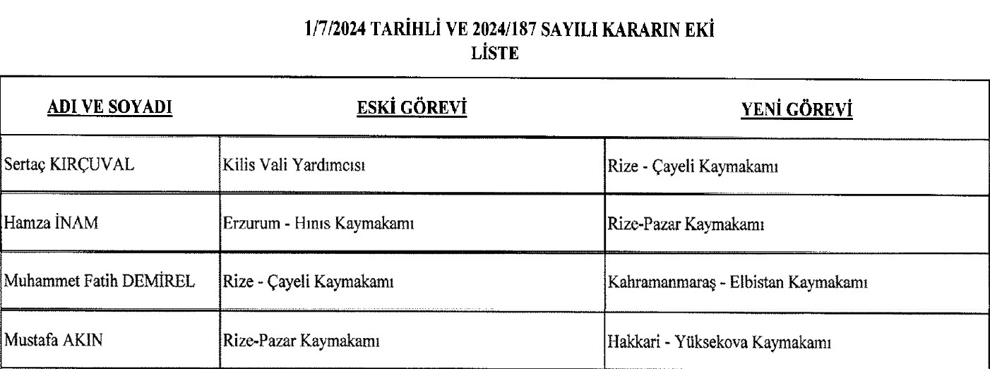 Buna göre, Çayeli Kaymakamı Muhammet Fatih Demirel, Kahramanmaraş Elbistan Kaymakamlığı'na atanırken, Demirel'in yerine Kilis Vali Yardımcısı Sertaç Kırçuval getirildi.