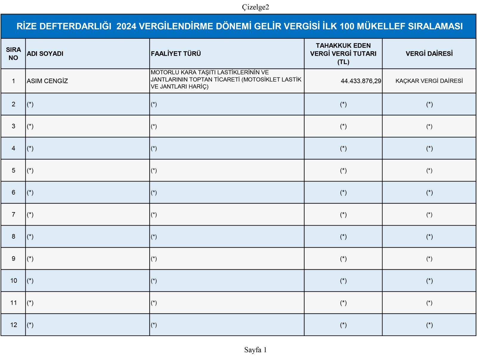 Buna göre, 44 milyon 433 bin 876,29 TL ile Asım Cengiz ilk sıradaki isim olarak, Rize'nin vergi rekortmeni olmayı başardı.