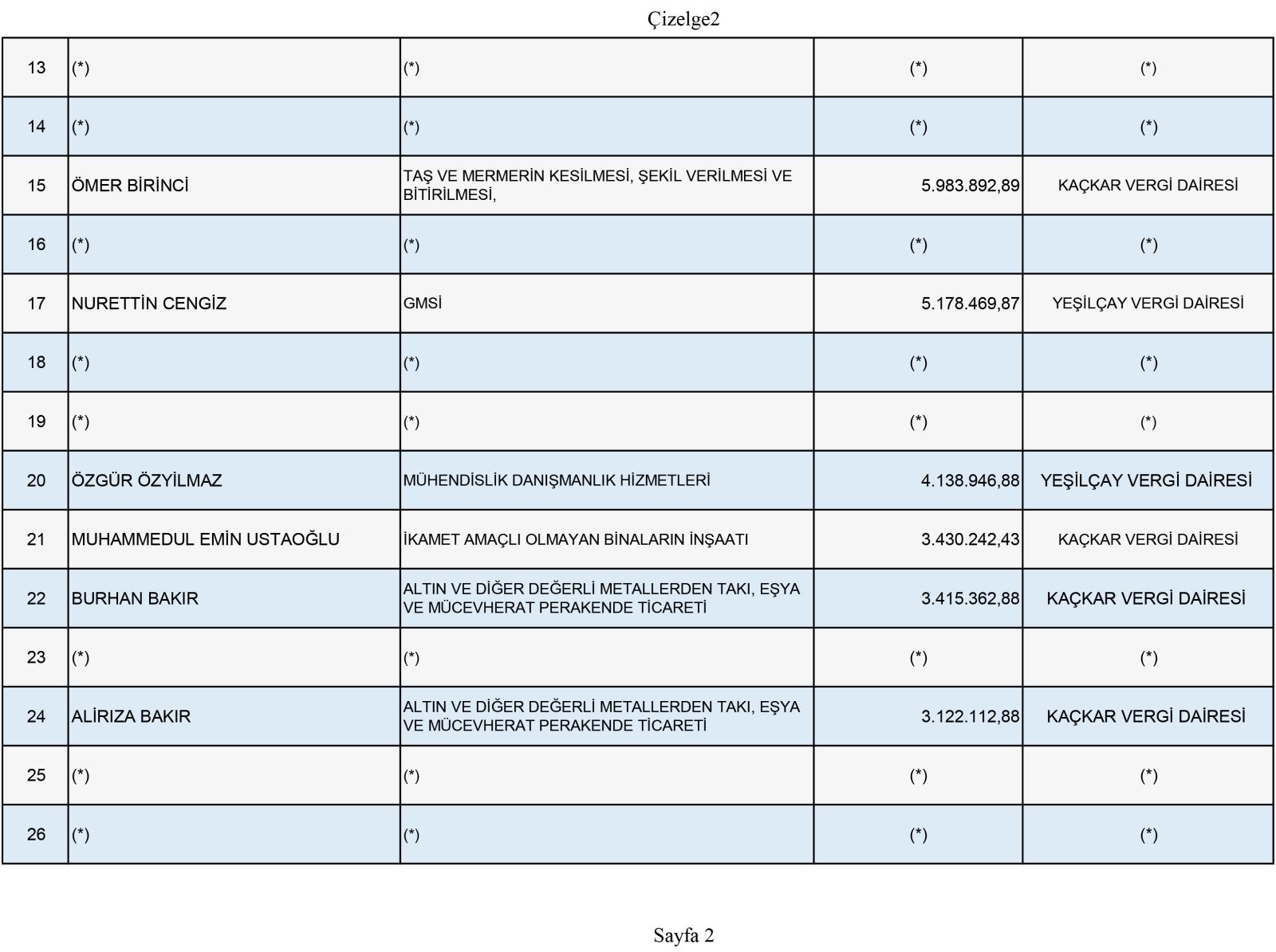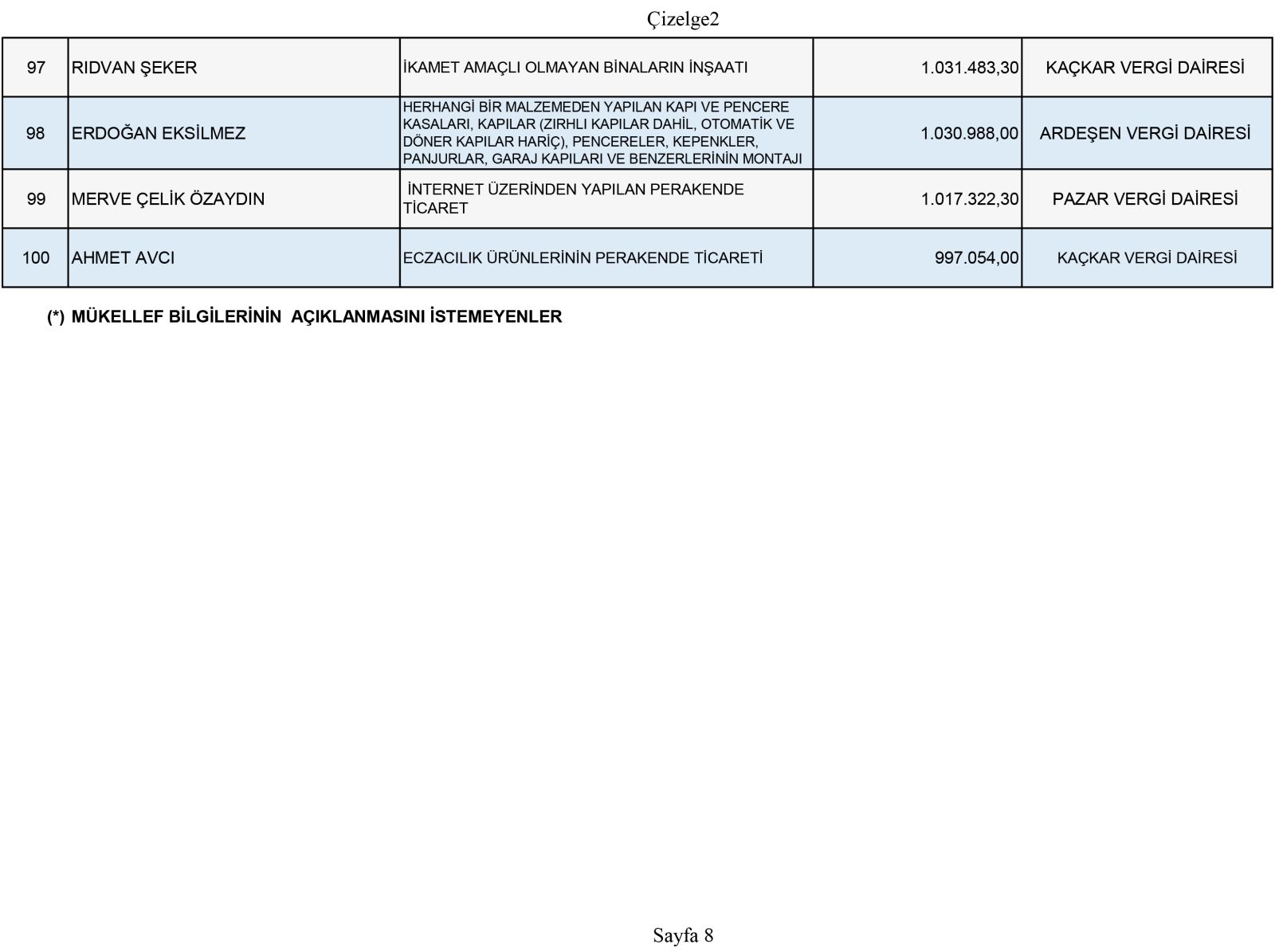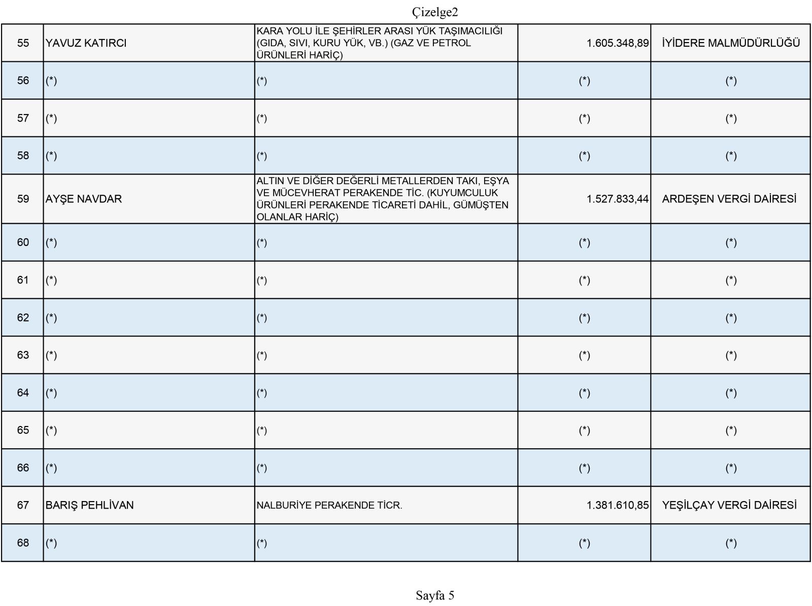 2 ile 14. sıra arasındaki mükellefler isimlerinin açıklamasını istemezken, 15. sırada 5 milyon 983 bin 892,89 TL ile Ömer Birinci yer aldı.