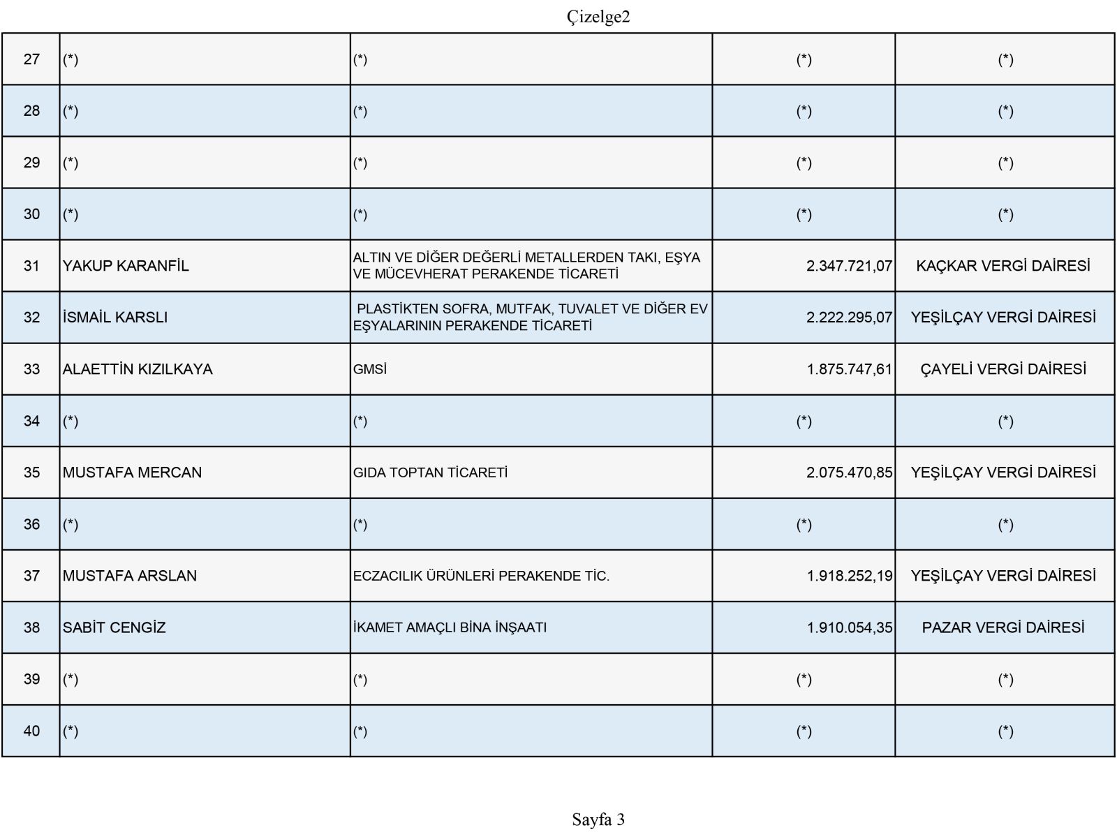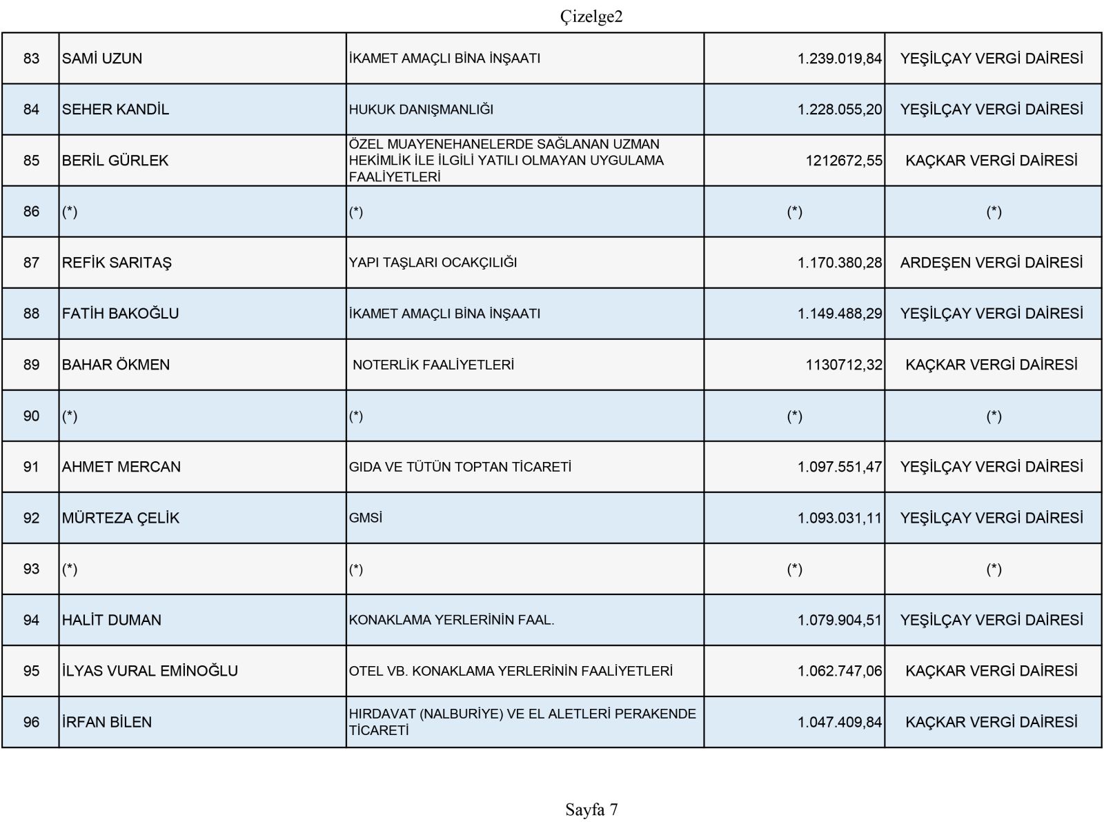 Listede, Nurettin Cengiz 5 milyon 178 bin 469,87 TL ile 17, Özgür Özyılmaz 4 milyon 138 bin 946,88 TL ile 20, Muhammedul Emin Ustaoğlu 3 milyon 430 bin 242,43 TL ile 21, Burhan Bakır 3 milyon 415 bin 362,88 TL ile 22 ve Ali Rıza Bakır 3 milyon 122 bin 112,88 TL ile 24. sırada bulundu.